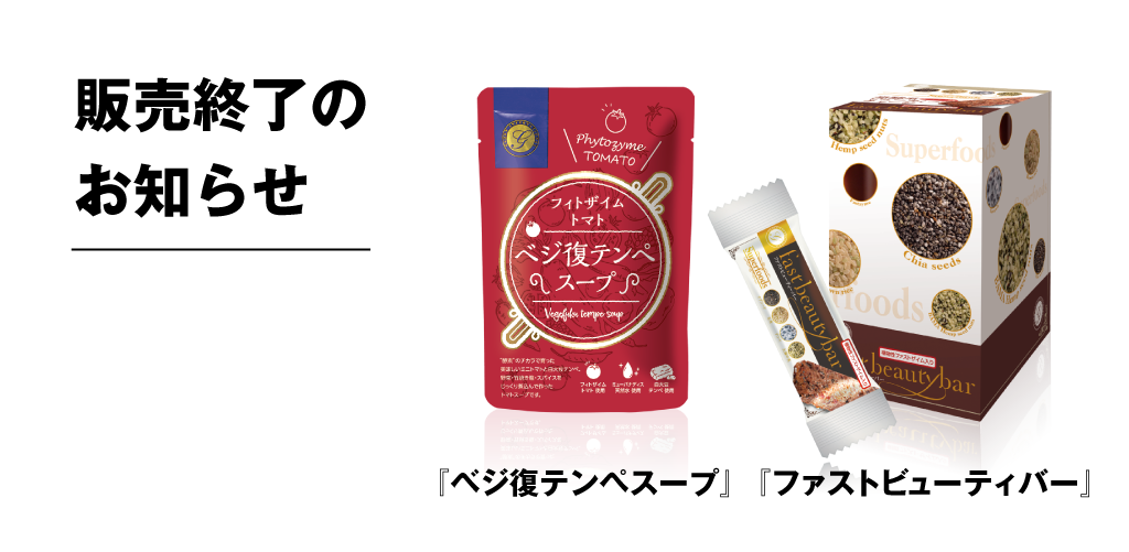 多くの方にご愛顧いただいております『ベジ復テンペスープ』、『ファストビューティーバー』につきまして、原料調達の都合により、誠に残念ではございますが、販売を終了させていただくこととなりました。