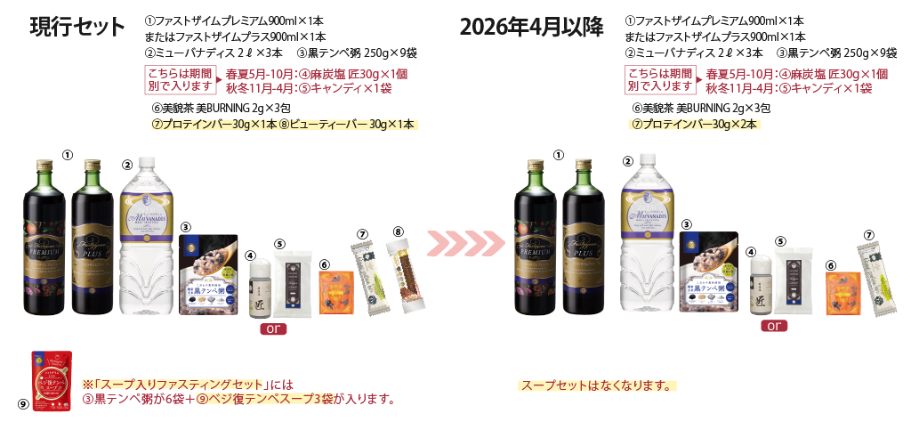 ご好評いただいておりますファスティングセットですが、ファストビューティーバーおよびベジ復テンペスープの販売終了に伴い、2026年4月よりセット内容を一部変更させていただくこととなりました。